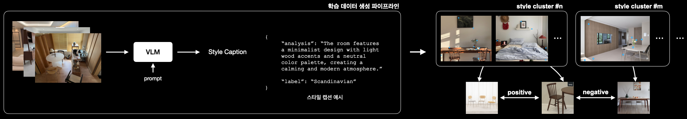 그래서 접근을 전환했다. 클러스터링으로 스타일을 구분하려고 하기보다, 서비스 관점에서 의미 있는 기정의 스타일 축(style axes)을 두고, VLM으로 이를 soft labeling한 뒤 metric learning으로 직접 “어울림”을 학습한다. 이 전환은 단순히 단계를 줄인 것이 아니라, 재학습 가능성, 분석 가능성, 운영 가능성을 모두 만족시키기 위한 선택이었다.