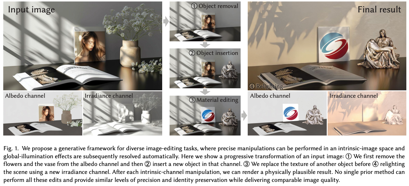 - IntrinsicEdit은 intrinsic space(예: shape/albedo/lighting)로 분해해 필요한 채널만 조작하고 재합성함으로써, 픽셀 수준 품질을 유지한 채 전역 재조명·재질 변화 같은 편집을 정밀하게 수행하려는 방향을 보여준다.